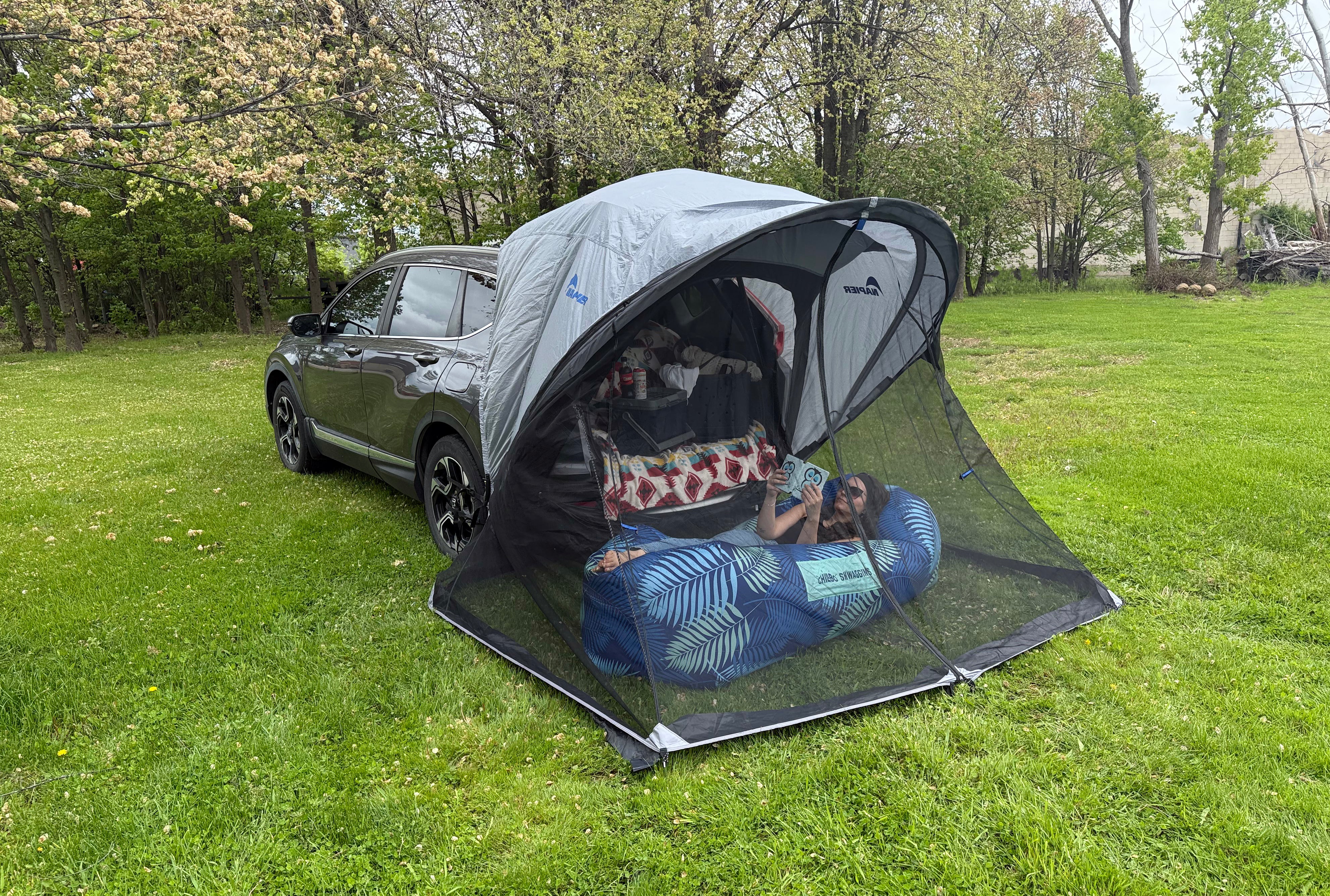 Nicolas Cela permet d'avoir un salon dans la van :) à l'abri des mouches! S'installe bien et tiens parfaitement. Je n'ai pas essayé par grand vent encore.