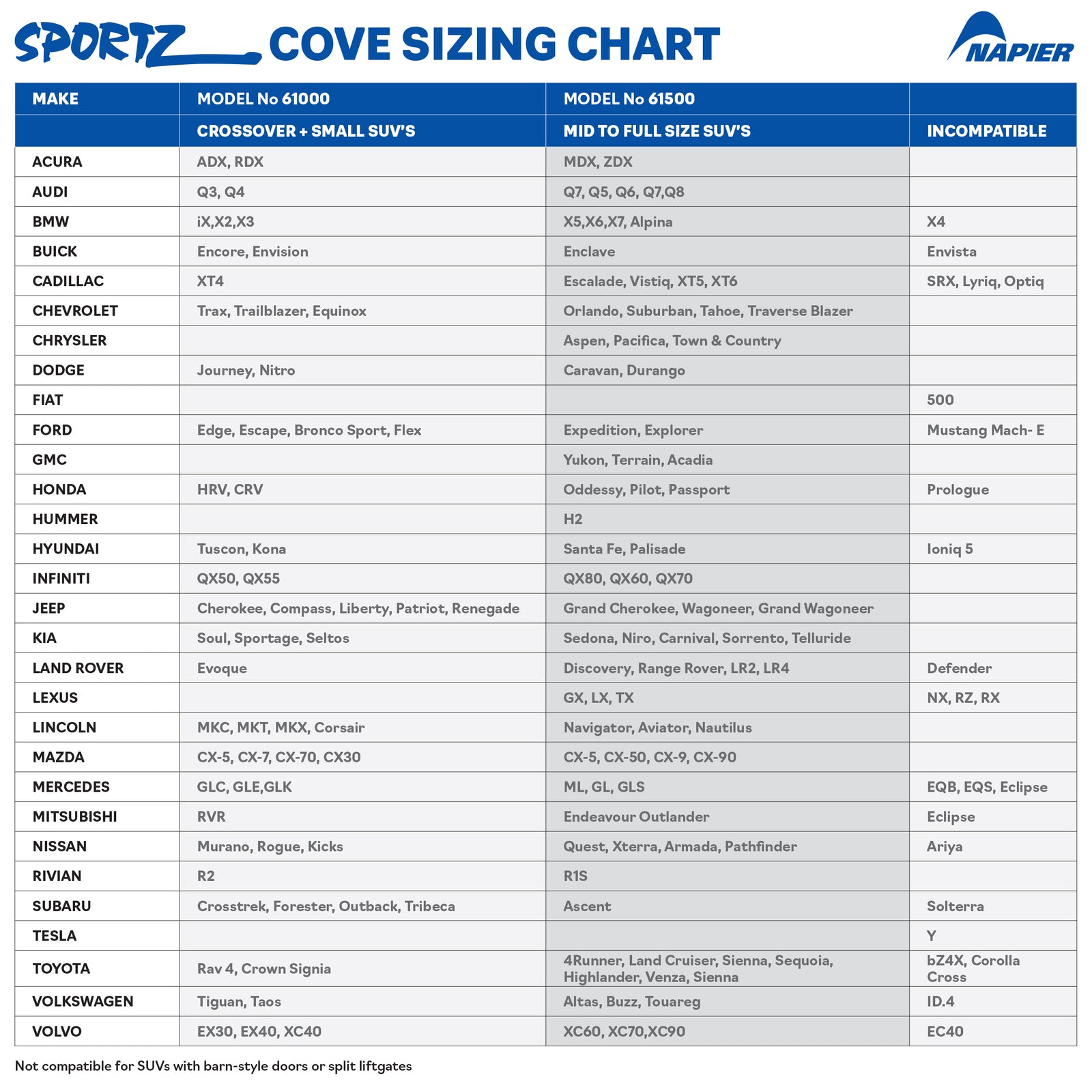 Incompatible models include: BMW X4; Buick Envista; Cadillac SRK, Lyriq, Optiq; Fiat 500; Ford Mustang Mach-E; Honda Prologue; Hyundai Ioniq 5; Land Rover Defender; Lexus NX, RZ, RX; Mercedes EQB, EQS, Eclipse; Mitsubishi Eclipse; Nissan Ariya; Subaru Solterra; Tesla Model Y; Toyota bZ4X, Corolla Cross; Volkswagen ID.4; Volvo EC40. Also not compatible for SUVs with barn-style doors or split life gates.