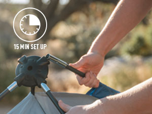 Built-in pole hub design allows for a quick and hassle-free car camping set-up in under 15 minutes. Includes expandable carrying bag for easy storage